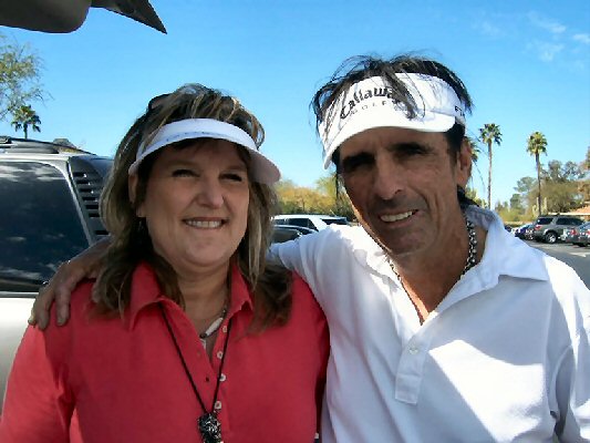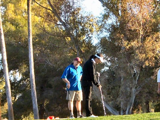 She might have the T-shirt and the hat... but where are the photos of her playing...? According to her the photo above is after hole 12... but where is the evidence? And don't use the old excuse that you were holding the camera! ;-) The photo on the left is of Alice and Ivy's husband, Lynn, on the course. |