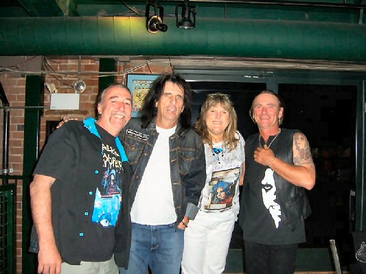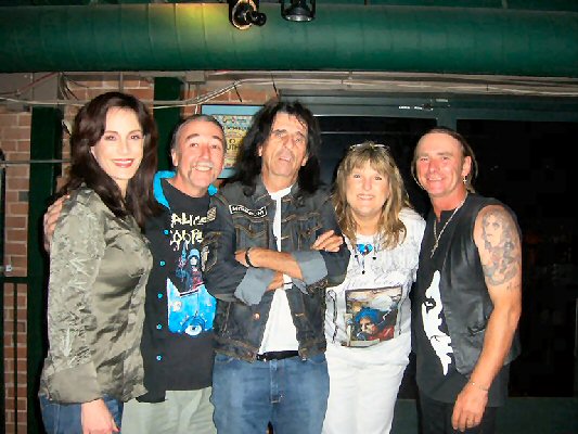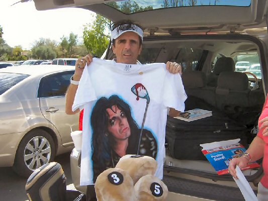 Alice looks surprised as he is handed a specially air-brush stencilled T-Shirt of his 'Golf Monster' book cover. If you don't see him wearing it on stage... I'm sure you'll see something very similar at the merchandise stalls! :-) Thanks for the photos Ivy; keep 'em coming! :-) |