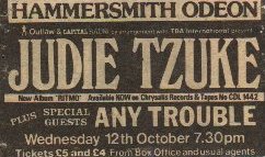 Judie played the Hammersmith Odeon, London, on the 11th and 12th of October 1983. The support band was 'Any Trouble'. The track list is as follows: